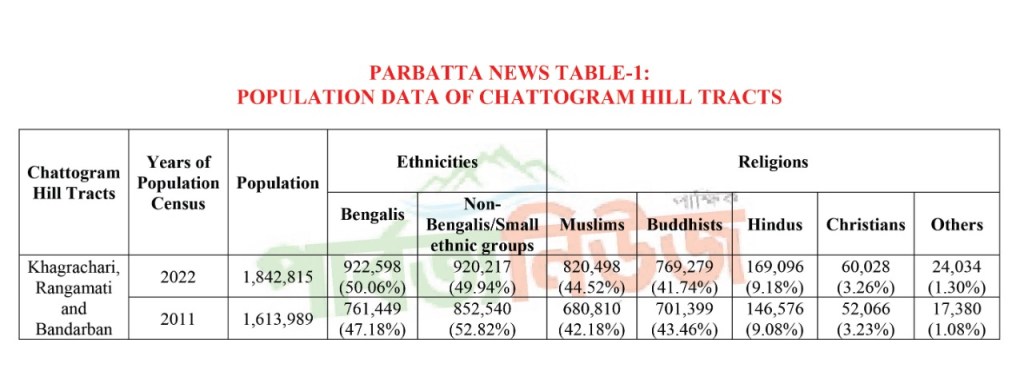 A comparative analysis of the preliminary report of the Population and Household Census 2022 recently released by the Bangladesh Bureau of Statistics (BBS) and the census report of 2011 shows that the Bengali population has increased while the non-Bengali/small ethnic population has decreased in Chattogram Hill Tracts. According to the preliminary report of the 2022 census, the combined population of the three hill districts, namely Khagrachari, Rangamati, and Bandarban, is 1,842,815. Of them, 922,598 (50.06%) are Bengalis, and 920,217 (49.94%) are non-Bengali/small ethnic people. The 2011 census report showed the total population of the three hill districts at 1,613,989. Of them, 761,449 (47.18%) are Bengalis, and 852,540 (52.82%) are non-Bengali/small ethnic people. That is, compared to the census of 2011, the percentage of Bengali people has increased by 2.88% while that of the non-Bengali/small ethnic people in Chattogram Hill Tracts has decreased by 2.88%.
