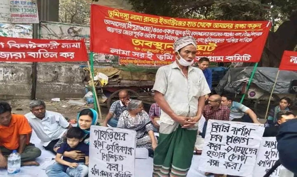 During the sit-in strike, the convener of Lama Soroi Bhumi Raksha Sangram Committee Rangdhajan Tripura, member of Committe and Karbari (head of Rengen Mro Para) Rengyen Mro and others spoke on behalf of the aggrieved villagers. Besides, the leaders of various political and student organizations of Dhaka also gave solidarity speeches.